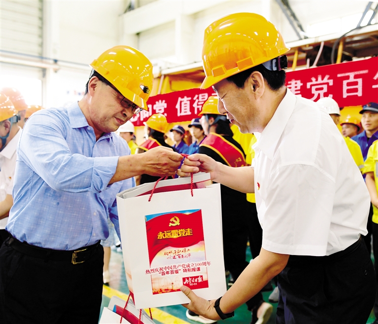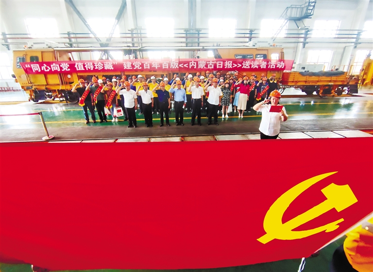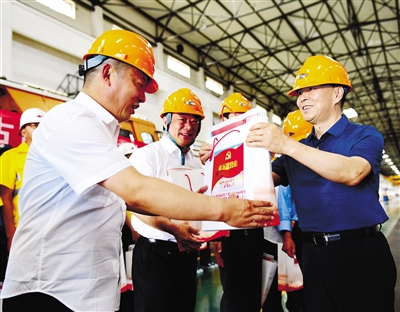 重温入党誓词后,内蒙古日报社党委副书记、副社长、总编辑孙亚辉,内蒙古日报社党委委员、副总编辑白喜辉为工友们赠送了报纸。孙亚辉还与大家分享了这份报纸的主要内容。