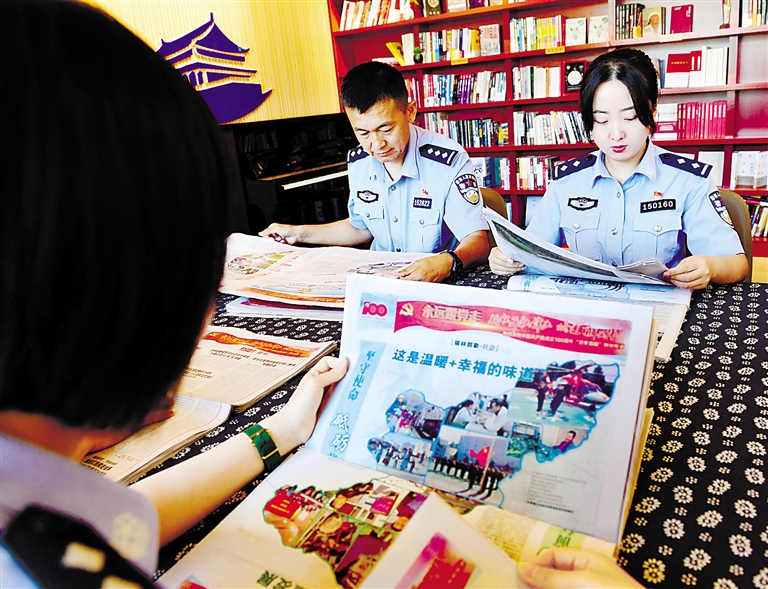 内蒙古出入境边防检查总站的警韵书苑,古朴典雅,收到报纸的民警围坐在长桌旁,迫不及待地开始翻阅。