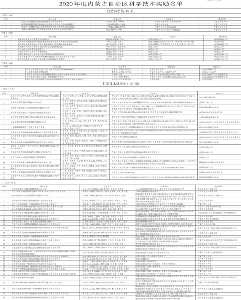 根据《内蒙古自治区科学技术奖励办法》有关规定,2020年度自治区科学技术奖候选成果经学科组网络评审、评审委员会评审和奖励委员会审定,共评选出自然科学奖授奖成果18项、科学技术进步奖授奖成果108项,现予公示。公示之日起15日内如有异议,请向内蒙古自治区科学技术厅提出。