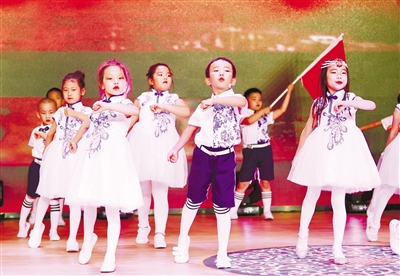 7月4日,呼和浩特市新城区蒙古族幼儿园的小朋友们正在表演节目。当日,该幼儿园举办“”2021届大班毕业典礼文艺汇演,老师和孩子们欢聚一堂、载歌载舞,以精彩的文艺节目向党的百年华诞献礼。