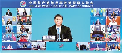 习近平首先发表主旨讲话。他指出,中国共产党成立100年来,团结带领中国人民接续奋斗,推动中华民族迎来了从站起来、富起来到强起来的伟大飞跃。中国共产党坚持中国人民和世界各国人民命运与共,在世界大局和时代潮流中把握中国发展的前进方向、促进各国共同发展繁荣。