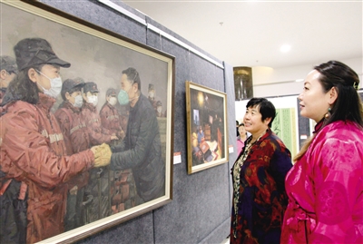 7月7日,人们在展现伟大抗疫精神的画作前驻足观看。当日,为庆祝中国共产党成立100周年,锡林郭勒盟举办了“翰墨掠影绘百年、砥砺前行跟党走”——红色百年锡林郭勒主题美术书法摄影展。本报记者 巴依斯古楞 摄