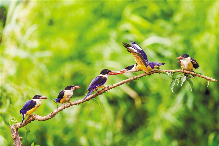 科尔沁右翼前旗索伦河谷,蓝翡翠给幼鸟喂食。