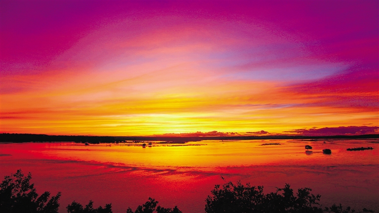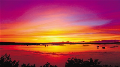莫力达瓦达斡尔族自治旗尼尔基镇诺敏河畔,落日余晖,红霞满天,水天一色,绚丽夺目。文/图 蒋希武