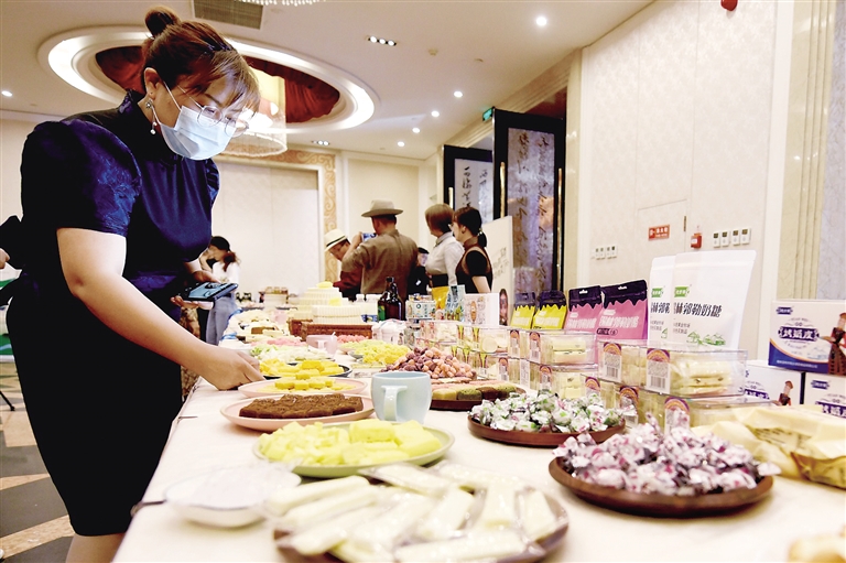 7月10日,消费者在推介会上品鉴奶食。当日,智游锡林郭勒“千里码”推介会召开,会上推出的“千里码”串接起锡林郭勒千里草原风景大道上多家旅游景区、酒店、旅游新业态,通过“线上”发行电子卡,让游客一卡畅享“吃、住、行、游、购、娱”全方位服务,一码畅游锡林郭勒大草原。 本报记者 巴依斯古楞 摄