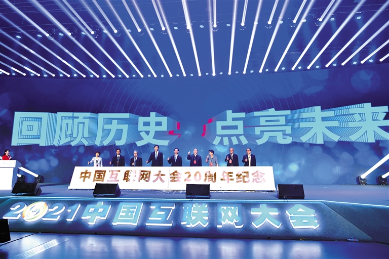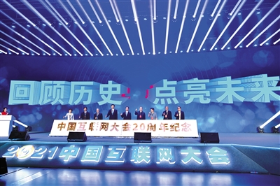 这是开幕式上举行的中国互联网大会20周年纪念仪式(7月13日摄)。当日,由中国互联网协会主办的2021(第二十届)中国互联网大会在北京国家会议中心开幕。本次大会以“新阶段、新理念、新格局——互联网引领数字经济新发展”为主题,采用线上线下结合的方式,举办开闭幕式、开幕论坛、分论坛、电竞表演赛、特色展览等活动,充分展示互联网及相关行业的新技术、新应用、新模式,大会将持续至7月15日结束。 新华社记者 李鑫 摄