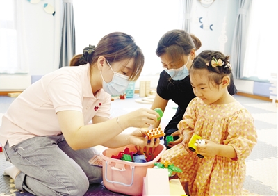 7月14日,在奉贤区奉浦街道秦塘生活驿站,早教老师在指导小朋友玩游戏。当日,“贤城早教专列”公益科学育儿指导服务走进上海市奉贤区奉浦街道秦塘生活驿站,专业人士为家长们提供亲子阅读、亲子游戏、营养健康、幼儿意外伤害急救等指导。今年以来,上海市采取“进楼宇、进园区、进场馆、进社区、进家庭”的方式,为更多适龄幼儿家庭提供精准的科学育儿指导服务。 新华社记者 刘颖 摄