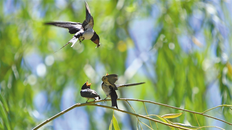 巴彦淖尔市临河区足球公园,燕子哺育雏燕。 文/图 张国玉