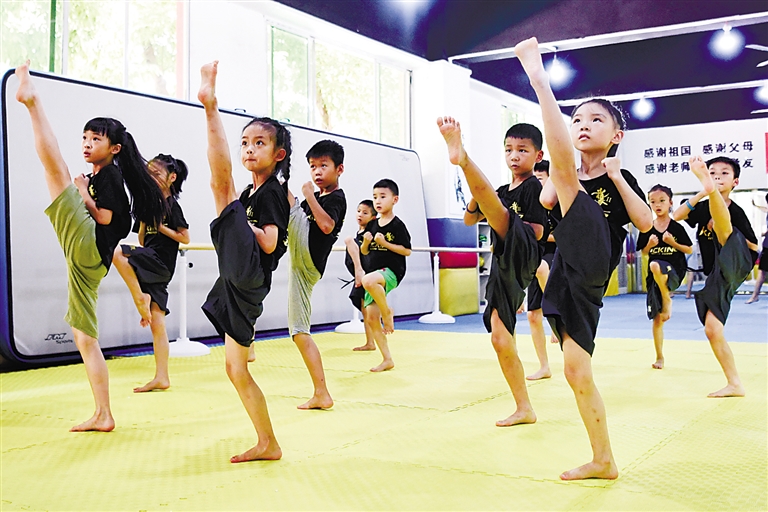 7月17日,学生在练习跆拳道。暑假期间,重庆市开州区青少年儿童体育学校举办暑期体育夏令营活动。孩子们在这里可进行武术散打、空手道、武术套路、摔跤、拳击、跆拳道、攀岩、网球、游泳等体育项目的训练。 新华社记者 唐奕 摄