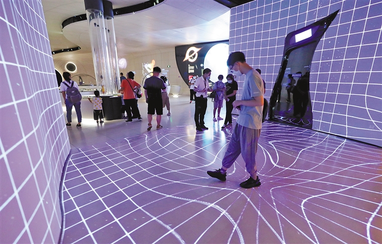 近日,上海天文馆举行媒体探营活动,参观者在体验由投影装置模拟的引力波。据悉,上海天文馆展陈分为“家园”“宇宙”“征程”三大主题展区,以及“中华问天”“好奇星球”“航向火星”等特色展区。