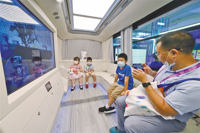 世界人工智能大会体验日,观众在自动驾驶AR小巴内参观。2021世界人工智能大会日前以线下线上结合的方式召开,今年的主题是“智联世界 众智成城”。 据新华社电