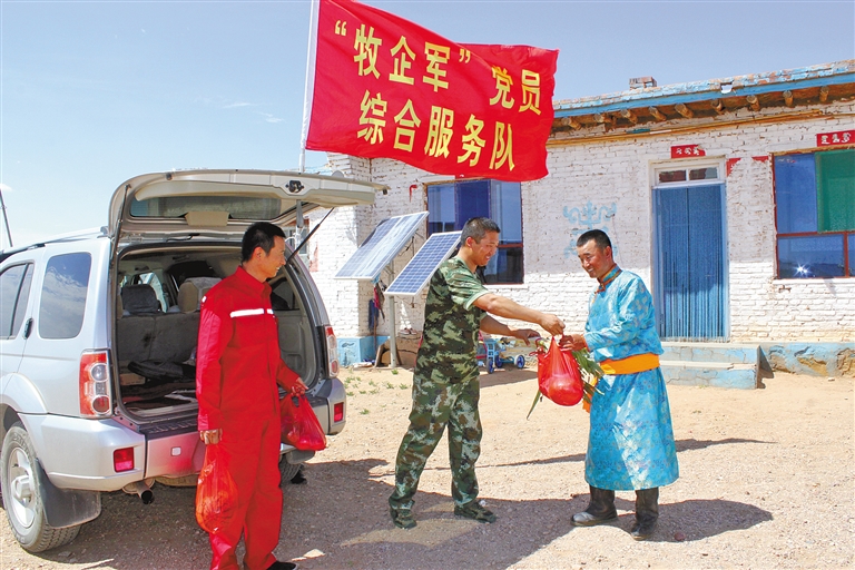 为打通服务群众“最后一公里”,近日,巴彦淖尔市组建“牧企军”党员综合服务队,广泛开展政策宣传、困难帮扶、物资代买等服务。图为服务队党员为甘其毛都镇巴音查干嘎查牧民代购蔬菜。赵姣 摄