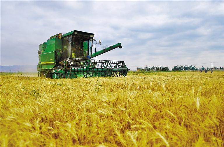 7月21日,巴彦淖尔市临河区新华镇新乐村的种植户正在收割小麦。巴彦淖尔市河套灌区是亚洲最大的一首制自流灌区,为加快农业产业结构调整,当地政府出台相关政策,鼓励农户集中连片种植小麦。今年巴彦淖尔市小麦种植面积约76.38万亩,为确保小麦颗粒归仓,当地农机部门组织700多台小麦收割机,与从河南、河北等地区调来的300多台收割机一起参与麦收作业,机收率达到100%。本报记者 怀特乌勒斯 摄
