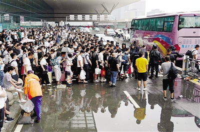 7月21日,滞留旅客在郑州东站进站口处排队登乘大巴车。7月20日,受强降雨影响,大量旅客滞留郑州东站。铁路部门连夜联系大巴车将旅客运往市区安全地带,并采取措施对滞留站内的旅客做好应急保障工作。7月21日上午,郑州东站候车大厅内滞留旅客已明显减少,工作人员在进站口处组织旅客登乘大巴车,并提供食品。新华社记者 李安 摄