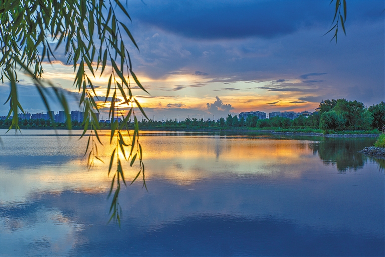 科右前旗札萨克图公园,晚霞绚丽,水面铺金,绿树环湖,柳丝不摆,如诗似画。 文/图 崔屹