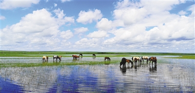 新巴尔虎右旗,碧草连天,水波荡漾,骏马悠然,嬉水觅食。文/图 刘钢
