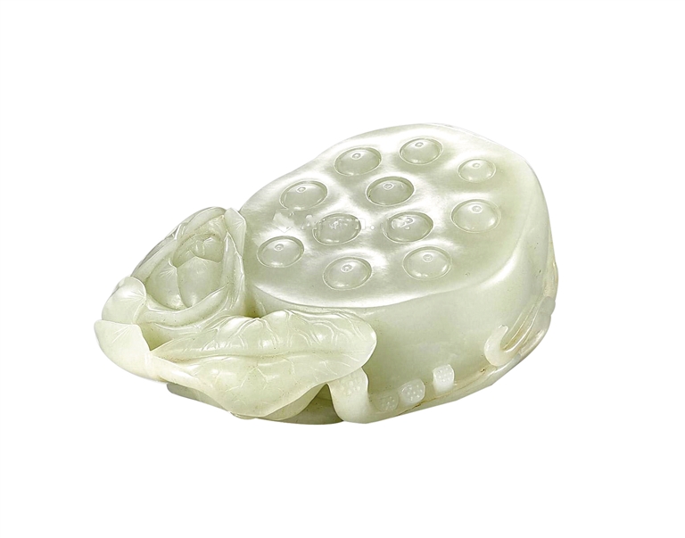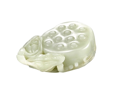 点评:乾隆平定准格尔部之后,和田玉料源源不断输入中原,且为官方名义上垄断,故而清宫一时得以制作大件玉器。此件玉雕莲蓬,体量硕大,应为乾隆时期拓土新疆之后的作品。在清代上至宫廷,下至民间皆喜谐音吉祥题材,莲蓬多籽,入题玉器则有多子多孙的寓意。