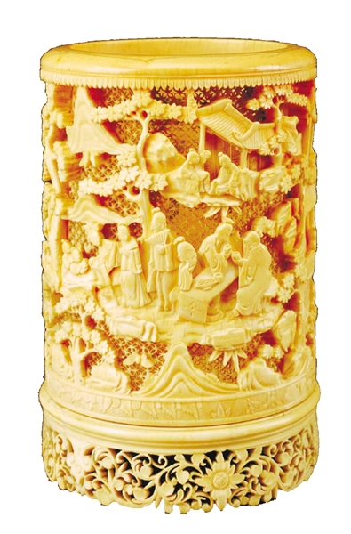 该笔筒材质为象牙。象牙质地细腻,硬度适中,光泽柔和,牙纹细洁,是制作高档工艺品的天然好材料。最初的象牙制品只是一种实用工具,随着时间的推移,逐渐出现了装饰用品,并成为牙雕工艺的主流。早在商周时代,我国的牙雕工艺就极其发达,后历经汉、唐、宋、元、明代,牙雕工艺更为精湛。清代中期达到鼎盛,并陆续形成了若干个相对集中的中心生产地,基本形成江南与广东两大艺术流派。由于文人雅士的偏爱,立意清新典雅的作品出现了,象牙雕刻艺术已逐步向“小品雕刻”的趋势发展,文房用具成了牙雕工艺的主要部分,这些象牙小件多以文人故事、花鸟图案,吉祥题材为装饰,散发着浓郁的文人气息。