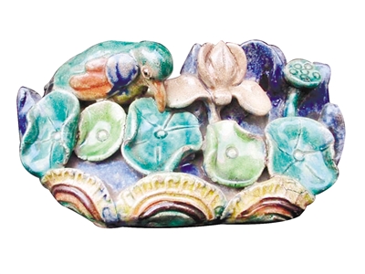 特点:这件清代中期石湾窑的贴塑一鹭莲升笔洗,是石湾陶艺风格的典型作品。笔洗敞口,腹下渐收。口沿满布冰裂纹,内壁施青釉,外壁以雕塑技法饰游鱼、贝类、莲叶等生物,硕大的莲花与莲蓬间蹲着一只栖息的鹭鸶,作休息状。整个笔洗色彩斑斓,栩栩如生,富有生机,妙趣无穷。