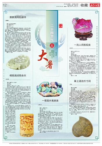 今时值大暑时节,南宋诗人陆游的《苦热》“万瓦鳞鳞若火龙,日车不动汗珠融。无因羽翮氛埃外,坐觉蒸炊釜甑中。”用形象生动的比喻表现出了大暑时节的炎热天气,最后一句的意思是“好像身处蒸笼”,读来颇是感同身受。此情此景,看到书案上晶莹剔透的白玉荷花莲房镇纸,是否有一丝清凉沁入心脾呢?