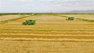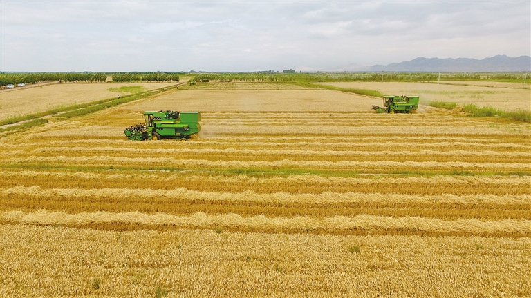 垄头金满地,又迎麦收季。7月21日,在巴彦淖尔市临河区新华镇新乐村,大型收割机于滚滚麦浪中穿梭作业。金灿灿的麦田里,村民们唱起他们自己改编的歌,分享丰收喜悦,赞美幸福小康生活。