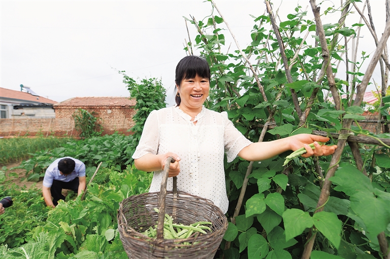 柳翠华挎着一只竹编的篮子,正在自家小园子里摘菜。“这两天雨水足,省了浇地的功夫。” 她笑呵呵地说。