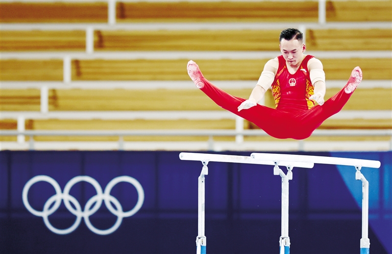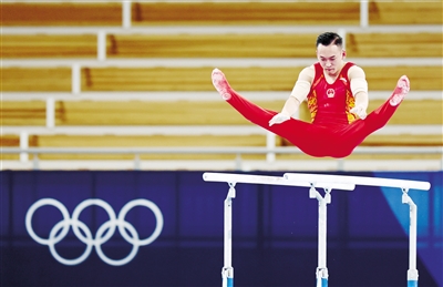 7月26日,中国队选手肖若腾在双杠项目比赛中。当日,在东京奥运会体操男子团体决赛中,中国队获得季军。 新华社记者 兰红光 摄