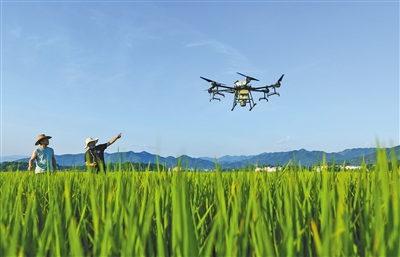 农技员操作植保无人机为水稻进行飞防作业。时值水稻中稻病虫害防治的关键时期,湖南省衡阳市常宁市及时组织各乡镇利用新型科技农用机具进行夏季田间管护,开展病虫害防治的精细化、智能化管理工作,为今年秋粮丰产丰收夯实基础。据新华社电
