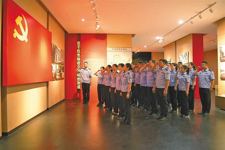 为深入开展党史学习教育,近日,呼伦贝尔市呼伦湖公安分局全体党员走进满洲里红色展厅参观,接受革命精神洗礼,并重温入党誓词,激发爱党爱国情怀。 本报记者 陈春艳 摄