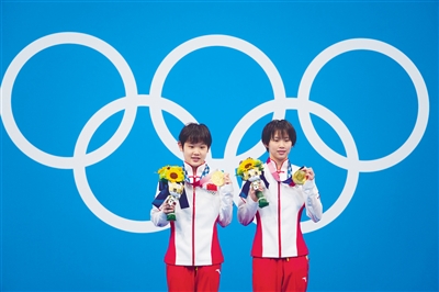 7月27日,中国选手陈芋汐(右)和张家齐在颁奖仪式上。当日,在东京奥运会跳水女子双人十米跳台决赛中,中国选手陈芋汐/张家齐夺得冠军。