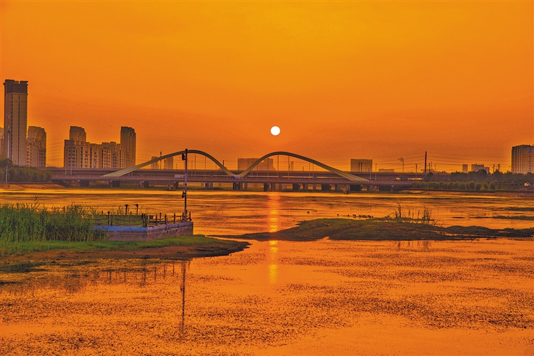 赤峰市松山区,高楼林立,长桥若虹,红日东升,彩霞满天,流水如金,芦苇静立,水鸟敛羽,祥和静谧。 文/图 杨智军