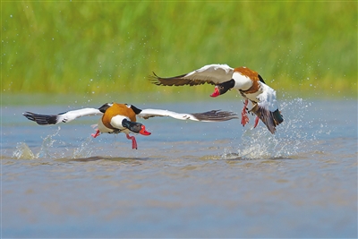 科尔沁右翼前旗,两只翘鼻麻鸭在水面争斗,一决高下。