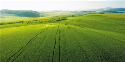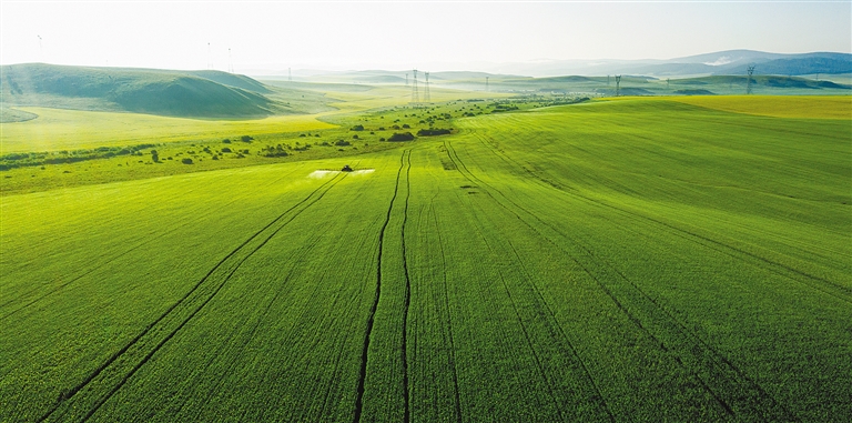 新巴尔虎左旗罕达盖杜拉尔农牧场,碧绿的麦田与金色的油菜花相映成趣。文/图 全东旭
