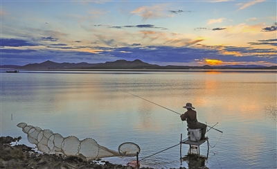 察尔森水库位于嫩江支流洮儿河中游,在兴安盟科右前旗境内,是一座以灌溉、防洪为主,结合发电、养鱼、旅游等综合利用的大型水利枢纽。图为一垂钓者提竿取鱼。 文/图 特格喜