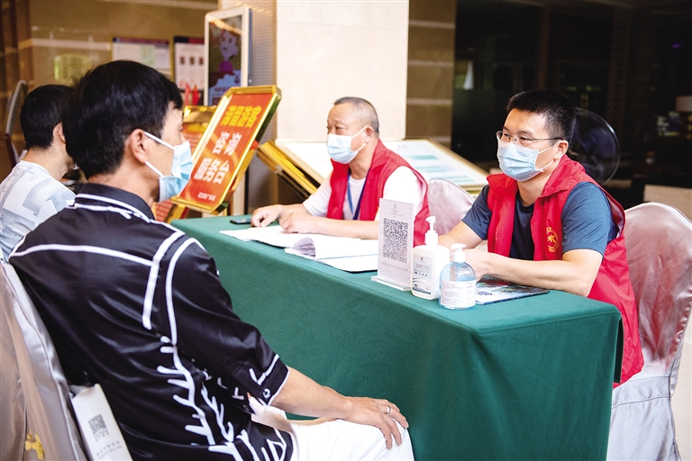 8月8日,在张家界青河锦江国际酒店大堂,翟勇彬(右一)协助登记滞留游客信息。8月3日,张家界市宣布,即日起,境内的居民、游客等所有人员不得离开。自驾来张家界旅游的湖北游客翟勇彬因此滞留在张家界市武陵源区。翟勇彬想为当地疫情防控出一份力,自告奋勇当起了志愿者,与当地文旅部门工作人员一起活跃在疫情防控一线。“我很乐意当一名志愿者!希望张家界早日恢复正常!”翟勇彬说。新华社记者 陈思汗 摄