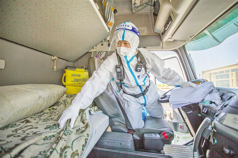 二连出入境边防检查站民警全副武装对通关车辆进行检查。内蒙古出入境边防检查总站二连出入境边防检查站民警身着防护装备坚守国门一线,筑牢疫情防线,确保口岸通关安全畅通。