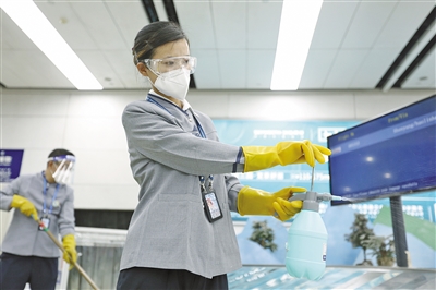 呼和浩特白塔国际机场的工作人员正在进行消杀作业。为严格落实“外防输入”防控部署,呼和浩特白塔国际机场加强消杀工作,要求旅客在进入航站楼时需佩戴口罩,主动出示健康码并配合工作人员接受体温检测。本报记者 王晓博 摄