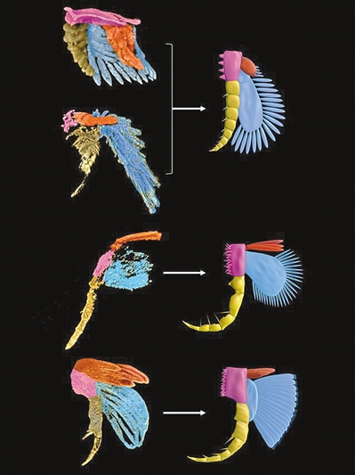 ●由中外科学家组成的研究团队借助显微CT扫描等技术,发现距今5.18亿年的云南澄江生物群中若干节肢动物双支型腿肢基部的新结构,进而揭示了节肢动物演化的复杂性。