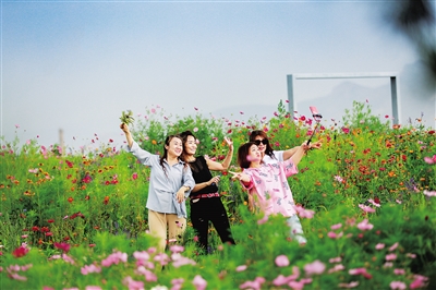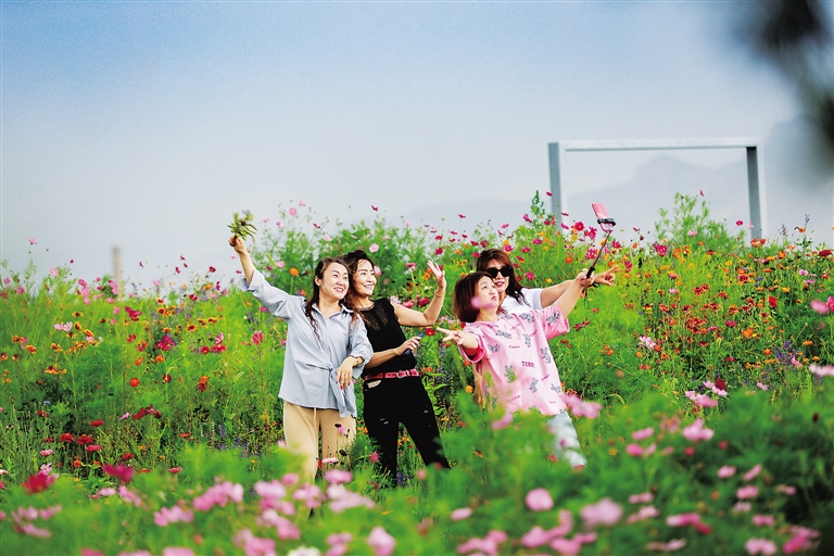 8月16日,市民在天骄花苑内赏花。据了解,呼和浩特市新城区园林绿化服务中心在110国道毫沁营大桥南侧打造了占地面积约200亩的“都市花海”——天骄花苑,曾经堆放垃圾的闲置空地种上了波斯菊、百日草、二月兰、蜀葵等十多个品种的花卉,成为市民打卡的好去处。本报记者 孟和朝鲁 摄