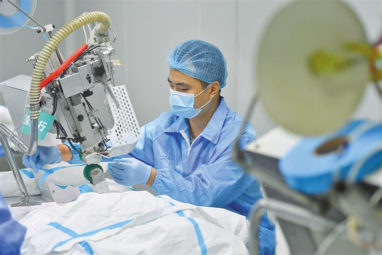 湖南一家生物科技发展有限公司的工人在生产医用一次性防护服。日前,为满足疫情防控需要,湖南省株洲市天元区内的医疗器械生产企业加紧医疗防控物资生产,全力保障医疗防控物资需要。新华社发