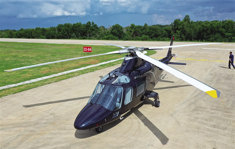 这是8月18日在金林海口甲子机场拍摄的海南自贸港首架“零关税”进口的阿古斯塔109E型直升机(无人机照片)。当日,海南自贸港首架“零关税”进口飞机在金林海口甲子机场正式亮相。该架直升机在进口过程中免征关税、进口环节增值税等,减免幅度约为15%,标志着海南自由贸易港“零关税”进口交通工具及游艇商品实现海陆空全覆盖。 新华社记者 郭程 摄