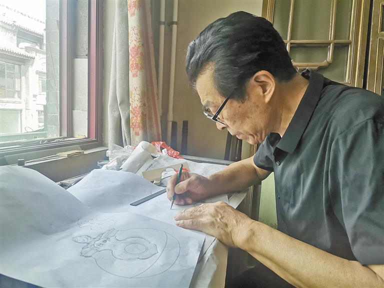 崔燕春在一楼的机器上细致地打磨着一把蒙古刀,崔锐在二楼设计绘制着一把银壶上的图案。图案绘制已近尾声,是佛教中的“八宝”:宝瓶、宝盖、双鱼、莲花、右旋螺、吉祥结、尊胜幢、法轮,每个图案大小均等,精细逼真。