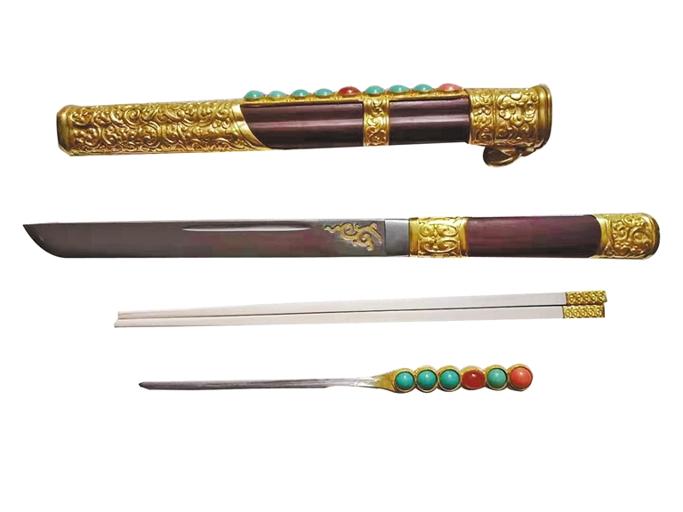 在内蒙古博物院从事文物修复时,崔锐成功复制了国家特级文物康熙宝刀。“康熙宝刀上的工艺特别复杂,刀上全是金丝,银、铜、木头上全都镶嵌着金子、贴着金箔,修复需要錾刻、镀金、鎏金、错金等多种工艺。而这些工艺,在古代都是高级铁匠的活儿。”