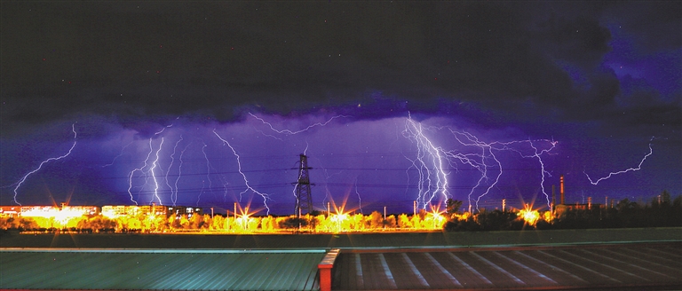 托克托县双河镇,劈天裂地的闪电与小镇霓虹浑然一体、令人震撼。文/图 马斌