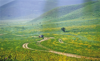 巴林左旗乌兰达坝苏木哈布其拉嘎查,薄雾飘渺,花草笼纱,小路蜿蜒,汽车缓行,宛如一幅水粉画。