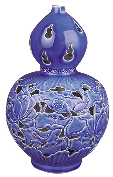 更值得一提的是这只葫芦瓶上的霁蓝釉。霁蓝,又称“积蓝釉”“祭蓝釉”“霁青釉",即雨过初晴天空之蓝,犹如水洗,清新淡雅。霁蓝釉瓷器创烧于元代景德镇,生坯施釉,1280℃到1300℃高温下一次烧成。这只霁蓝葫芦瓶,色调浓淡均匀,灵气十足又采用了镂空工艺,迎光透影,呈现出如烟似雾般的景致,给人一种流动感的宝石般的恬静美。