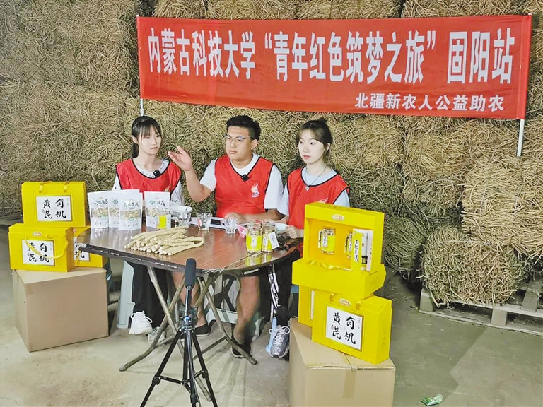 近日,内蒙古科技大学“北疆新农人”公益助农团队来到包头市固阳县永茂丰合作社有机黄芪种植基地,以直播带货等方式助力乡村振兴。汤伟 摄