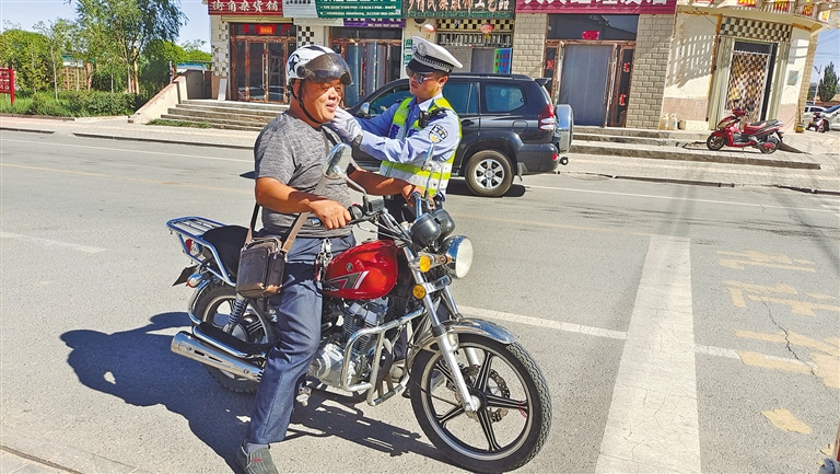 近日,阿拉善盟阿拉善右旗公安局交管大队开展“文明驾驶,安全出行”平安服务活动。图为交警帮助摩托车驾驶员整理头盔。本报记者 安寅东 摄