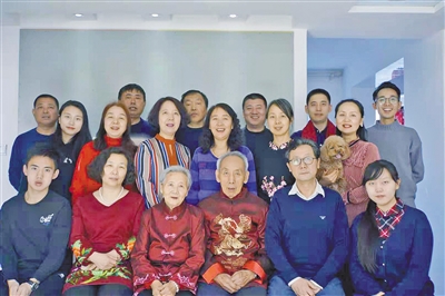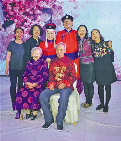 呼和浩特海关离退办工作人员朱春华(后排右二)和她的民族融合大家庭合影留念,坐在前排“C位”的两位长者分别是母亲吴秀清和父亲朱震。朱春华告诉记者,她的母亲是蒙古族,生于1935年12月25日,今年85岁,原为通辽市科左中旗某企业员工;父亲是汉族,生于1934年9月18日,今年86岁,是科左中旗统计局退休干部。两位老人于1953年经人介绍结识并组合成家庭,多年来互相鼓励、互相帮助、相濡以沫地共同走过了67载岁月春秋。朱春华介绍,父母一生育有6个子女,分别就职于文化、教育、企业和政府部门,在两位老人的言传身教下,孩子们也都秉承民族团结的优良家风,儿媳和女婿中既有汉族也有蒙古族,相处极为融洽,一大家人和和美美,孝老爱亲。更让两位老人深感喜悦的是,孙儿朱江迎娶了如意爱侣,与一位朝鲜族姑娘喜结连理,让这个民族团结一家亲的幸福家庭倍增喜气。(朱春华 供图)
