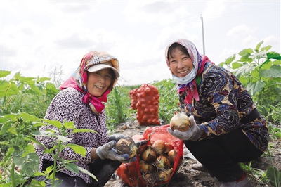 同样沉浸在喜悦中的,还有在家门口赚“外快”的农民们。圆葱在育苗、种植、间苗、除草、管理、收获的每一个环节都需要大量人工的投入,眼下正值收获期,更是吸引了周边大量农户前来务工,不仅帮种植户解决了采收难题,也增加了农民的收入,家住突泉镇长安村的李香云就是其中一员:“我年年过来摘圆葱、装袋,一天能挣130元钱,也不耽误家里干活。”